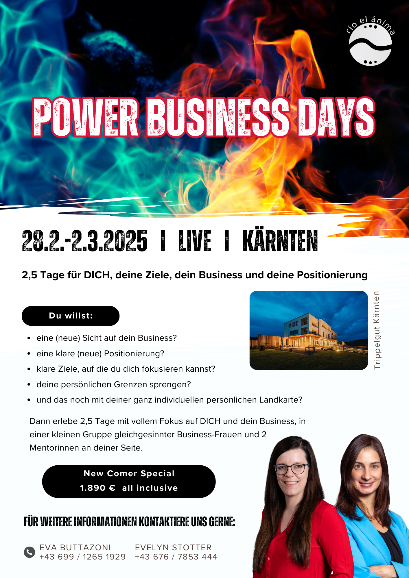 Die Power Business Days geben dir die Chance dich 2 Tage lang voll und ganz auf dich und dein Business zu konzentrieren. Finde Gleichgesinnte und lass dich von uns durch den Prozess führen, den es braucht, um wieder klar in DEINE richtige Richtung zu steuern.